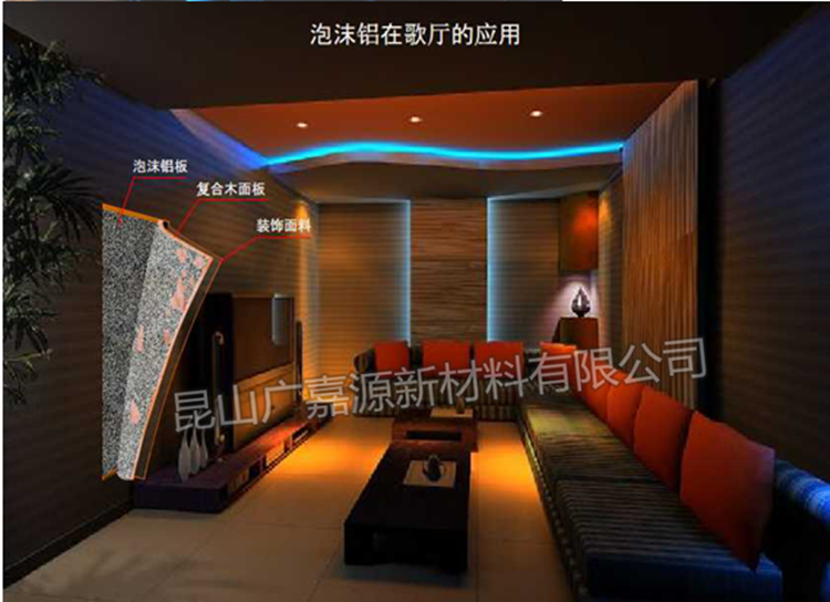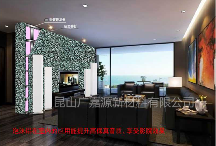 吸聲、隔聲材料:泡沫鋁可用于城市輕軌、高架公路、地下隧道、機械設備的噪聲治理及聲學室、多功能廳和其他室內聲響效果的改善。吸聲的泡沫鋁粘貼到混凝土或鋼結構上,豎在高架橋、輕軌兩旁作為大型吸音墻,可以減輕城市交通噪聲。隔聲的泡沫鋁可用于工廠機房、機器設備、戶外建筑工地的噪聲隔離,解決了目前廣泛應用的玻璃棉、石棉等吸聲材料的許多局限性。